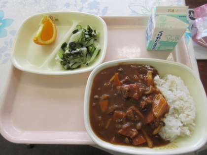 「麦ごはん・牛乳・ハヤシシチュー・わかめサラダ・オレンジ」のメニューです。昔、「カレーもいいけどハヤシもね」ってコマーシャルがあったようなないような?ハヤシもありですね。