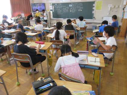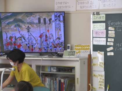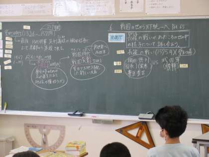 6年生社会、歴史の学習です。戦国時代から天下が統一されるまでを扱った学習です。「長篠の戦があったころの世の中の様子について話し合おう」をめあてに、資料を基にいろいろなことを言い合っていました。話が交錯して見ていて面白いクラスです。