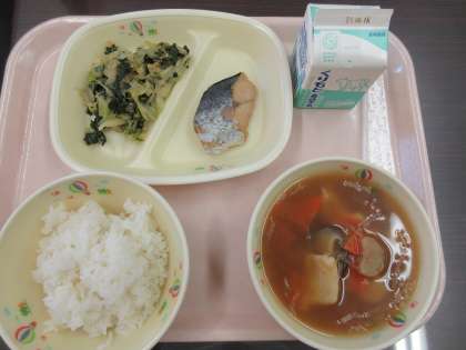 「少なめご飯・牛乳・秋さわらの照り焼き・とっちゃなげ汁・ほうれん草のごま和え」の和食メニューです。和食メニューだと郷土色や季節感が出ます。これが日本食の良い点ですね。今日のメニューの「とっちゃなげ汁」は、鬼石地区に伝わる郷土料理です。味噌味の「すいとん」のようなものなのでしょうか。すいとんを鍋にとっては投げ入れたからとか、父っちゃんがそれをしたからとか、諸説があるそうです。おいしさは味噌味がまさに味噌ですね。また、「秋さわら」という言葉を初めて知りましたが、さわらは鰆と書くように春を告げる魚といわれていますが、実は秋のさわらの方が脂がのっておいしんだそうです。本日はたくさん勉強になりました!