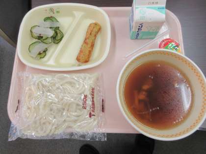「パックうどん・牛乳・ちくわの磯部揚げ・五目うどん汁・梅肉和え・ミニピーチゼリー」のメニューです。夏のように暑い日なのでのど越しの良いうどんはGOODでした。うどんは群馬の粉文化の最たるものです。金曜日のすいとんと連続して、味わうことができました。