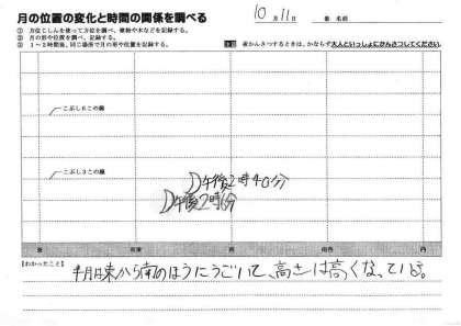 10月11日(月)授業風景〜6校時4年理科〜月と星の位置の変化 公開日 2021/10/11 更新日 2021/10/11 2021.9〜できごと 半月の位置の変化と時間の関係を調べました。 時間がたつと半月は東のほうから南のほうへ位置が変わることがわかりました。