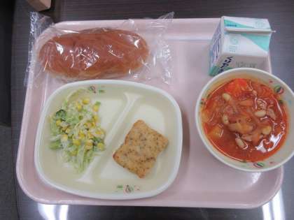 「ミルクパン・牛乳・フィレオチキン・ポークビーンズ・コーンサラダ」のポップなメニューでした。「チキンもいいけど野菜もね!」ってヒデキがいいそうです。ブロッコリーがとてもおいしかったのですが、子どもたちにわかるかなあ・・