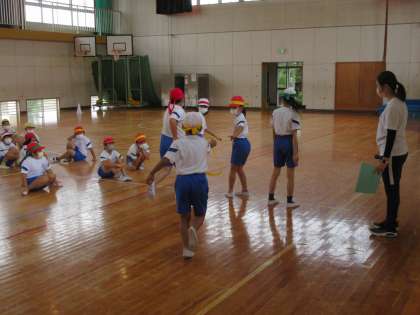 10月13日(水)授業風景〜2校時3・4年合同体育〜 公開日 2021/10/13 更新日 2021/10/13 2021.9〜できごと 本日は雨天なので、3・4年生の合同体育は体育館で体育学習発表会に向けた練習を行っていました。リレーの順番確認やバトンの受け渡し方について、体育館内にトラックに見立てたコースを作り、実際に軽く走りながら確認をしていました。