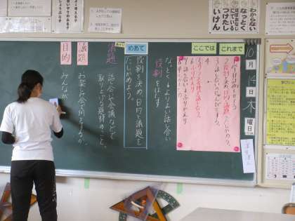 10月14日(木)授業風景〜1校時4年国語〜 公開日 2021/10/14 更新日 2021/10/14 2021.9〜できごと 4年生の国語の授業です。「クラス全体で話し合い決めごとをする」という単元の学習です。単元の学習計画が提示され今度の行程なのかがわかります。
