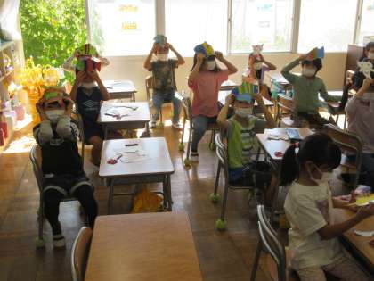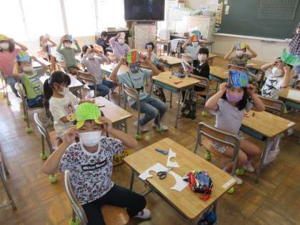 1年生は図工で「さかなの絵」をかいて、切り取って、頭に付けていました。教室中にかわいい魚がいっぱい泳ぎました。体育学習発表会での表現発表の際に使うのでしょうか。