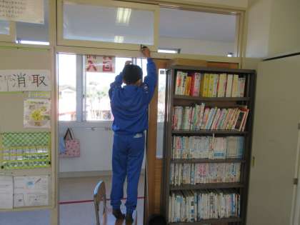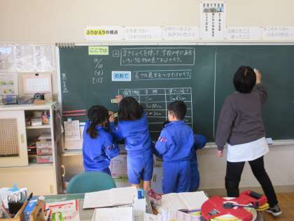 三年生の算数です。「長いものの長さを比べよう」の学習です。本日は「長さの見当を付けてはかろう」のめあてのもとで、だいたいの予想をつけてから教室内外のいろいろな部分の長さを巻き尺を使ってはかっていました。