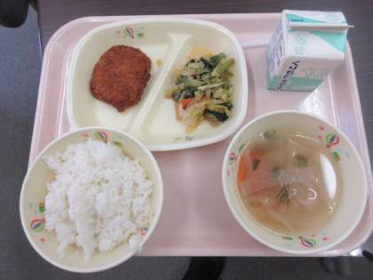「ごはん・牛乳・甘辛上州メンチカツ・春雨スープ・小松菜サラダ」のメニューです。甘辛メンチカツはご飯にのせて、ソースメンチカツ丼にして食べました。丼物はテンションアップ間違いなしです。今日はメンチカツでしたが、これがとんかつならソースかつ丼ですね。群馬も日本4大ソースカツどん県で有名です。皆さん知っていますか?福井・長野・群馬・福島(会津)と本州の中央部に位置している県なので興味深いですね。また、本日の春雨スープの中には藤岡北校の生徒が栽培した水菜が使われているとのこと。地元の食材に興味がわく意味でも大変良いことだと思います。