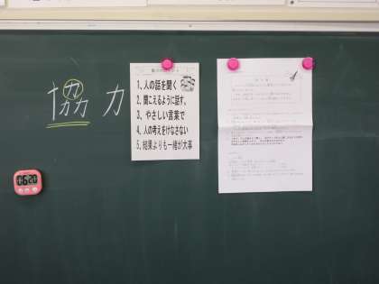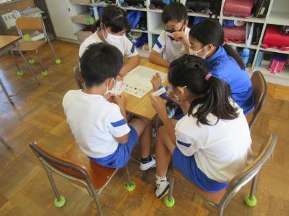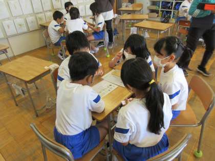 4校時に4年生の学級活動の時間に、スクールカウンセラーさんによるグループワークトレーイングの授業をしていただきました。4〜5人のグループで協力しながら、ある課題を仕上げていきます。ヒントカードを一人ずつ読んでいくのですが、みんなで話し合い、助け合わないと最終的な解決に至りません。最初はなかなか切り出せなかった話し合いも、次第に良い話し合いができるようになっていきました。