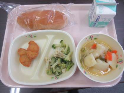 「ロールパン・牛乳・チキンナゲット・じゃがいものバター煮・花野菜サラダ」のドイツの人が食べているようなポップなメニューでした。(実際はどうだかはわかりませんが・・)ジャガイモのおいしさが感じられる料理でしたが、今ジャガイモが高騰してるので原価がちょっと心配?