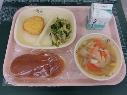 今日のメニューは「ミルクパン、牛乳、チキンピカタ、ABCスープ、花野菜サラダ」です。