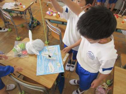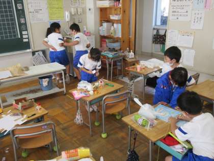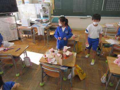 1年生の生活科の授業です。「あきのおもちゃ作り」で秋を感じさせるものを使っておもしろいおもちゃを作っていました。できたおもちゃで試しに遊ばせてもらいましたが、予想以上に面白かったです。