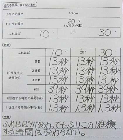 ふりこの1往復する時間は、ふれはばによっては変わらないことがわかりました。