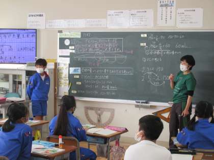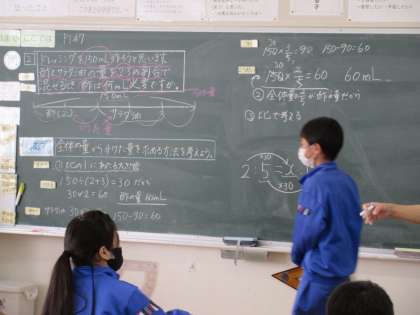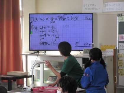 6年生の算数で、比の学習です。「全体の量から分けた量を求める方法を考える」ことを本時のめあてにして、これまでに学習したことを使って各自が考えたことを、それぞれ説明していました。発表した児童のネームプレートも貼ってあります。各児童の考えを書いたノートは実物投影機でみんなに見えるように映してありました。