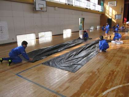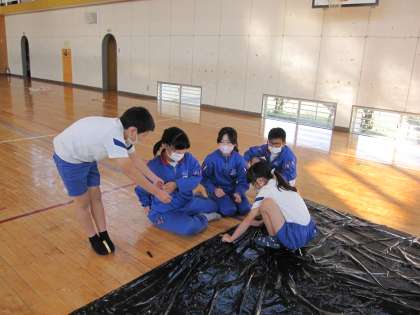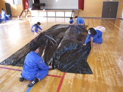 農業用マルチをセロテープで貼り合わせて、ソーラーバルーンを作っています。