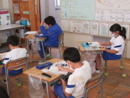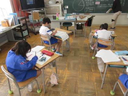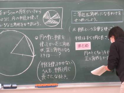 3年生の算数です。5校時でも眠さに負けずに頑張っています。今は、図形の単元で三角形を今学習しています。本時の「めあて」に対して「まとめ」を児童の言葉で表現していました。
