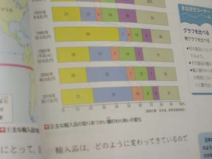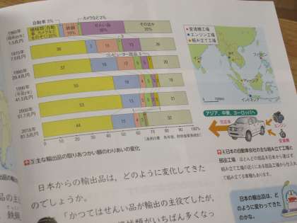 5年生の社会です。「日本の輸入と輸出の特ちょうについて調べよう」をめあてに、本時は輸出の特徴について資料を基に考えていました。前時に輸入の特徴を調べたことを、つなぎ教材として、比較しながら輸出の特徴について考えていました。