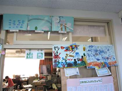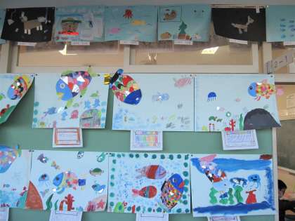 廊下の壁に展示してあるのは、「にじいろの魚」と「ざいりょうからひらめき」です。