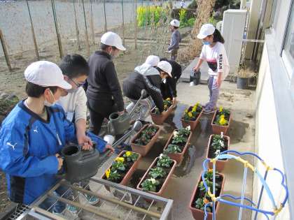 緑の少年団の活動として、プランターにパンジーとビオラの苗を植えました。学習発表会や卒業式、入学式で会場を飾る花です。各クラスで水やりや花がら摘みをして、大切に育てていきます。
