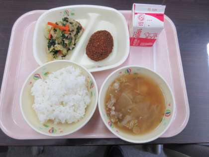「ごはん・牛乳・甘辛メンチ・豚汁・おひたし」の定食屋さんメニューです。甘辛メンチや豚汁といい、群馬を意識したメニューでした。なんでも甘辛く煮るのは群馬の食文化ですね。