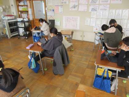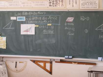 5年生も算数です。三角形の面積の学習です。いろいろな三角形の面積もすべて同じ公式で求められることを確認しました。早く課題ができた子は、タブレットでドリル問題を行っていました。