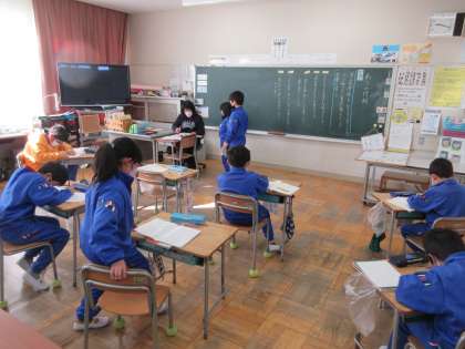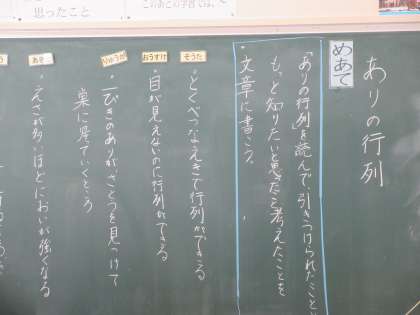 3年生も国語です。「ありの行列」の単元です。「文章を読んで、引き付けられたこと・もっと知りたいと思ったことを文章に書こう」をめあてにした学習でした。たくさんの児童のネームプレートが黒板に貼られていました。