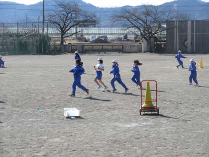 2年生の体育です。校庭で元気に「鬼あそび」をしていました。