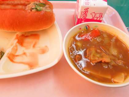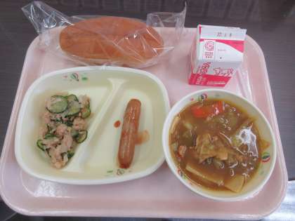 「背割りコッペパン・牛乳・フランクフルト・カレーワンタン・大根とツナのサラダ」の多国籍メニューです。ドイツ・インド・中国・日本・・・たくさんの国が目に浮かびます。フランクフルトはパンにはさんでホットドックにして食べました。カレーワンタンは、いい出汁が出ていておいしかったです。