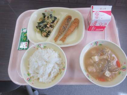 「ごはん・牛乳・いわしのカリカリフライ・鶏つくね汁・大豆のごま和え・のりふりかけ」の節分メニューです。本当は明日が節分なのですが、明日はパンの日なので今日になりました。イワシや大豆を使っていますが食べやすいように工夫をしたメニューになっています。