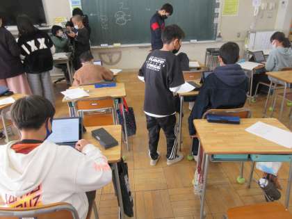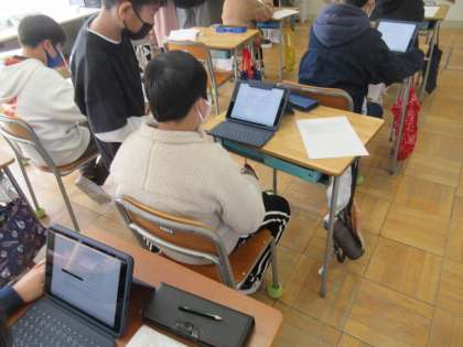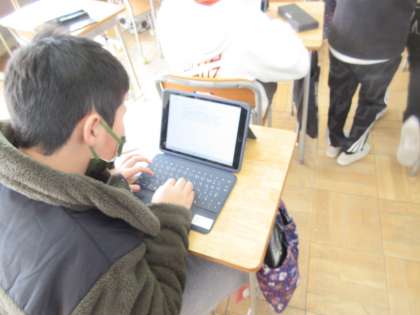 6年生の国語です。「思い出を言葉に」の単元の学習です。各自の思いをタブレットで文章に打っています。中学生になるとタブレットが変わります。このタブレットともあと少しでお別れです。