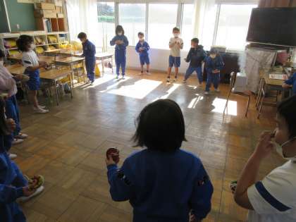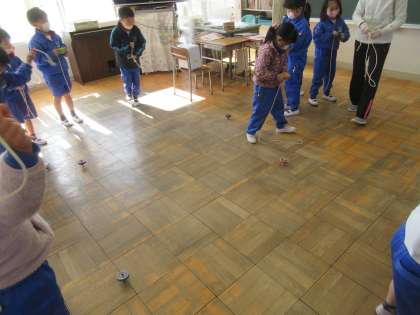 1年生の生活科「むかしのあそび」の単元です。みんなで色を塗ったコマを回していました。一斉に回すと壮観でした。