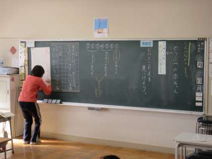引き続き1年生の国語です。「どうぶつの赤ちゃん」の単元、説明文の学習です。説明文には「問い」と「答え」がありますので本時はそれを見つけることがめあてです。