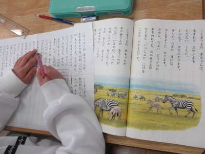 1年生の国語「どうぶつの赤ちゃん」の学習です。本時はしまうまの赤ちゃんに焦点を当て、どのように大きくなっていくのかを読み取りました。ライオンとの対比がポイントです。