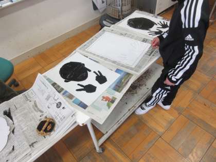 1年生の図工「かみはんが」の授業です。みんな素敵な顔と手が刷り上がっています。並べるとみんなでお話ししているようです。