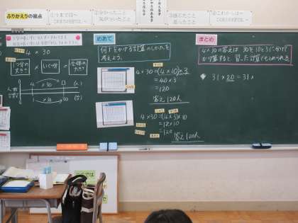 3年生の算数です。かける数が何十の時の計算方法を考える授業でした。「今までに習った計算で求められるように考え方を工夫する」ことがまとめになりますが、まさに学びのつながりを生かした計算方法といえます。