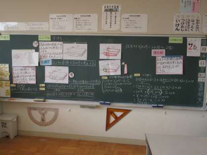 6年生の算数です。およその容積の求め方を考える学習です。いくつかの求め方を子どもたちが発表したのちに、まとめとして「およその容積も面積が求められる形を見ればわかる」ことを見出しました。