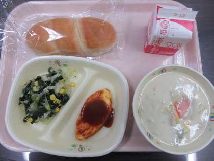 「ロールパン・牛乳・オムレツデミグラスソースかけ・冬野菜のシチュー・ほうれん草のサラダ」のメニューです。「はくさい・ブロッコリー・かぶ・にんじん」の冬野菜を使ったシチューは野菜の甘さが感じられるシチューでした。今日のように寒い日にはうってつけです。