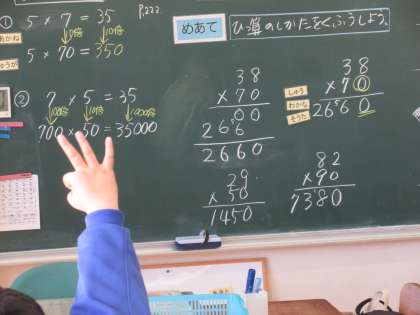 2月18日(金)授業風景〜2校時3年算数〜 公開日 2022/02/18 更新日 2022/02/18 2021.9〜できごと 3年生の算数です。工夫シリーズで、いくつかのかけ算において、工夫して簡単に求める方法を考えました。計算の工夫について納得したかどうかを、ハンドサインを活用して確認をしていました。