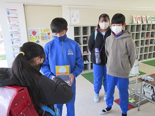 朝の登校時、児童会役員が玄関に立ち、1円玉募金を呼びかけました。