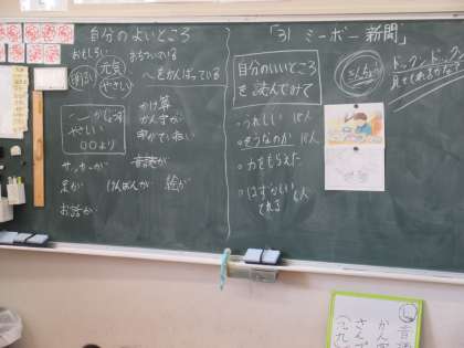 3月3日(木)授業風景〜2校時2年道徳〜 公開日 2022/03/03 更新日 2022/03/03 2021.9〜できごと 2年生の道徳です。「ミーボ—新聞」という資料を用いて、「自分のよいところ」について考えました。