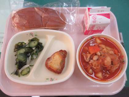 「くろパン・牛乳・チキンのチーズ焼き・ポークビーンズ・海藻サラダ」のエスニック系(?)料理といった感じです。牛乳はもとより、今日の給食に使われている大豆や海藻にはカルシウムがたくさん含まれていて、強い骨や筋肉を作るのに役立つそうです。