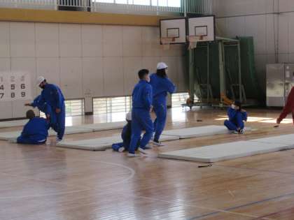 6年生は体育館で体育の授業です。幅跳びの練習です。