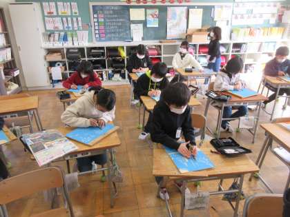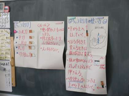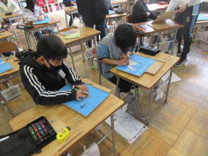 4年生も図工「掘って刷って見つけて」の学習です。初めての木版画に挑戦しています。今は元の木に色がついていて、掘るとよくわかるようになっているのですね。