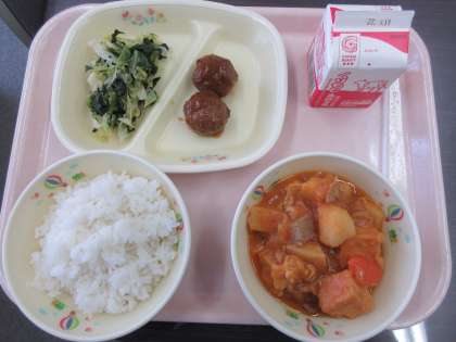 「ごはん・牛乳・きんぴら肉団子・黄金煮・ほうれん草のオイル和え」のおばんざいメニューです。肉団子にはゴボウやニンジンなどの根菜類が入っていて、抵抗なく野菜が摂取できます。根菜類は体を温めるのに適しているそうです。