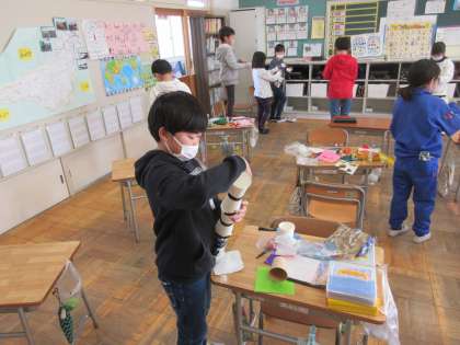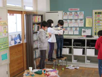 3年生の理科です。ゴムの力で動くおもちゃを製作し、みんなでとばして楽しんでいました。