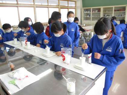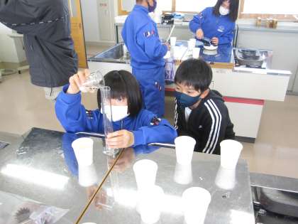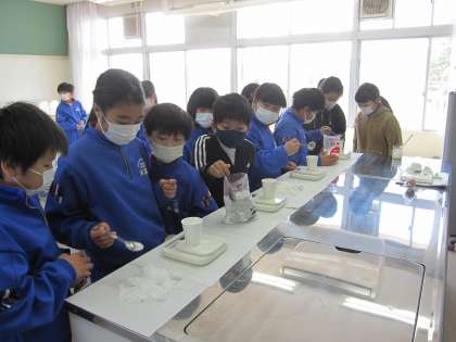 3月15日(火)授業風景〜1・2校時4年理科〜カルメ焼き作り(その1) 公開日 2022/03/15 更新日 2022/03/15 2021.9〜できごと カルメ焼きを作って、実験器具の使い方の復習をしました。 はじめに、電子てんびんで砂糖50gをはかりとります。つぎに、メスシリンダーで水40mlをはかりとります。