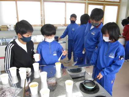 3月15日(火)授業風景〜1・2校時4年理科〜カルメ焼き作り(その4) 公開日 2022/03/15 更新日 2022/03/15 2021.9〜できごと 紙コップの中の砂糖水はもこもことふくらんでカルメ焼きになります。
