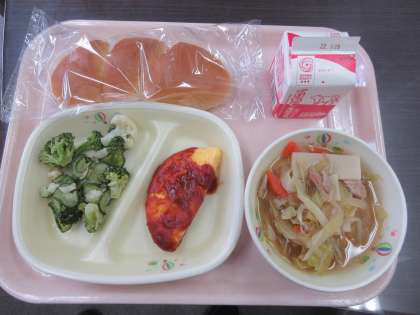 「ロールパン・牛乳・オムレツのトマトソースかけ・ワンタンスープ・花野菜サラダ」のまさに給食ならではの多国籍メニューでした。ワンタンが入っているせいか、ボリュームもあるメニューでした。