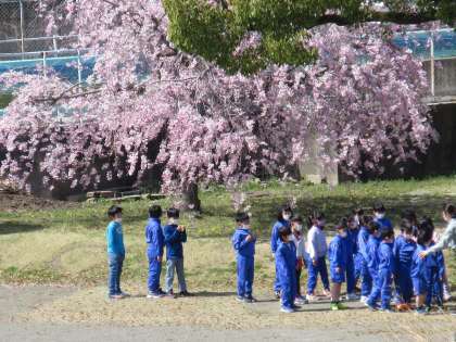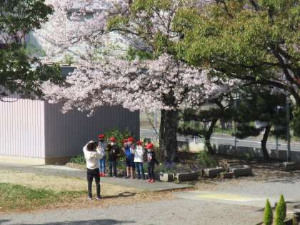 校庭の桜の木の下で、写真を撮っているクラスも・・・今が散り際の桜で本当にきれいです。