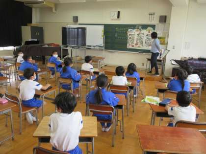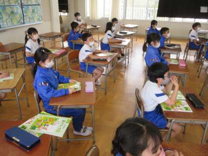 3年生の音楽です。3年生までは担任の先生の指導です。今日は校歌について、再度学習していました。歌詞の確認からスタートです。3年生は元気がいいので、大きな声で歌うことができていました。