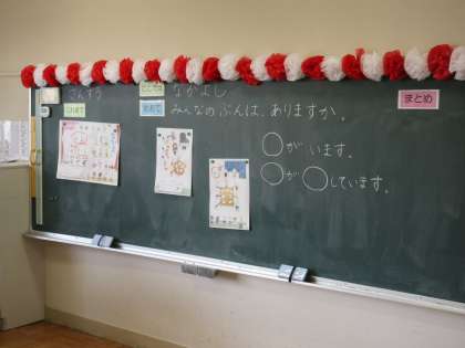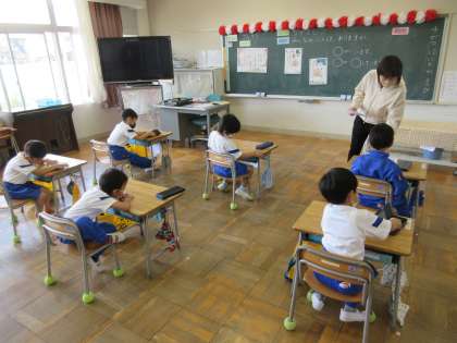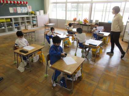 1年生の教室です。いよいよ算数も始まりました。最初は図を見て考える問いが多いようです。6人の児童に教員が2人ついています。個別指導が行き届き、どんどん進んでしまいます。